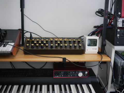 ゲスト参加機材スペースは50cm幅あるので、セミユーロラックモジュールやミニ鍵盤の機材などは、まあまあ何でも置けるはず。これまではPrologueの後ろにタブレットスタンドを置いて、それに機材を置いていたのだが、Prologueのパネルが隠れてしまうし大きいものは載せにくいので、やはり無理があった。