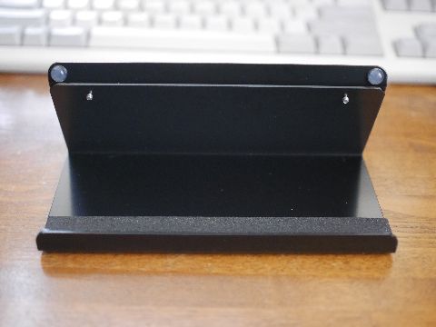 それでいろいろ探して、長尾製作所の「マザーボード&キーボードをを美しく飾れる専用ディスプレイ台 NB-KEYBD-DP02」というのをスタンド代わりに使っている。これは価格もAmazonで1500円程度と手ごろで、鉄製で頑丈で良い。お勧め。