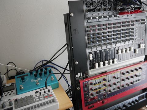 なお実は、ミキサーに8U、Nord Rack2に4U、t.c.electric M350に1U必要で、1U分足りないのでミキサーの頭がラックから飛び出している。