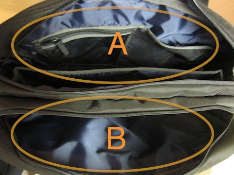 AとBのしきり部分のA側にPC収納用のポケットが一つ。